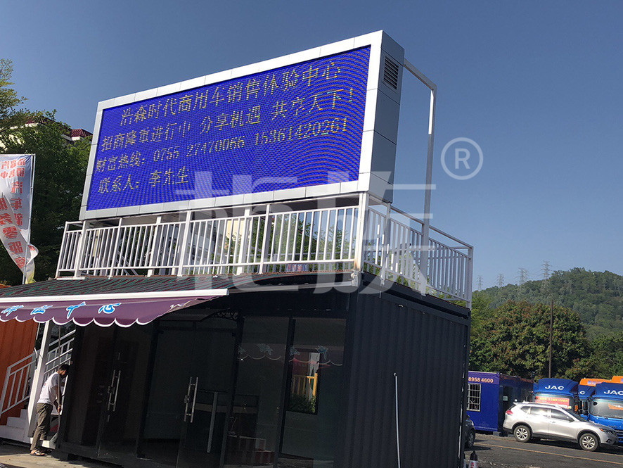 小而精的辦公室,一樓辦公帶遮陽(yáng)棚,側(cè)面樓梯可達(dá)二樓平臺(tái)。承重力強(qiáng),箱頂豎有大型LED廣告屏。室內(nèi)設(shè)衛(wèi)生間,可兼任住宿和短時(shí)休息用途。