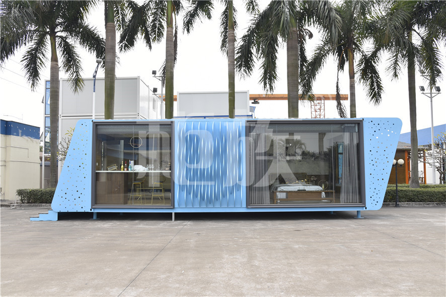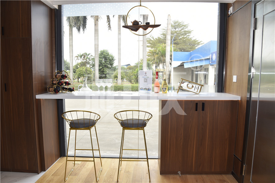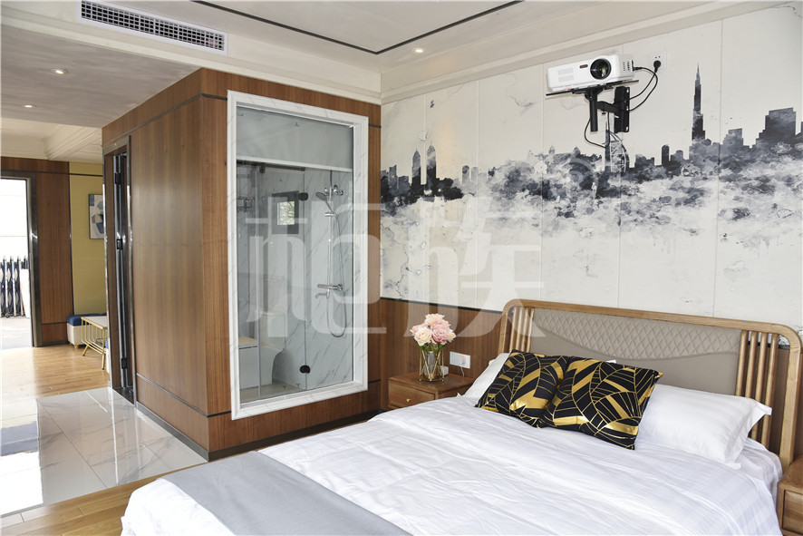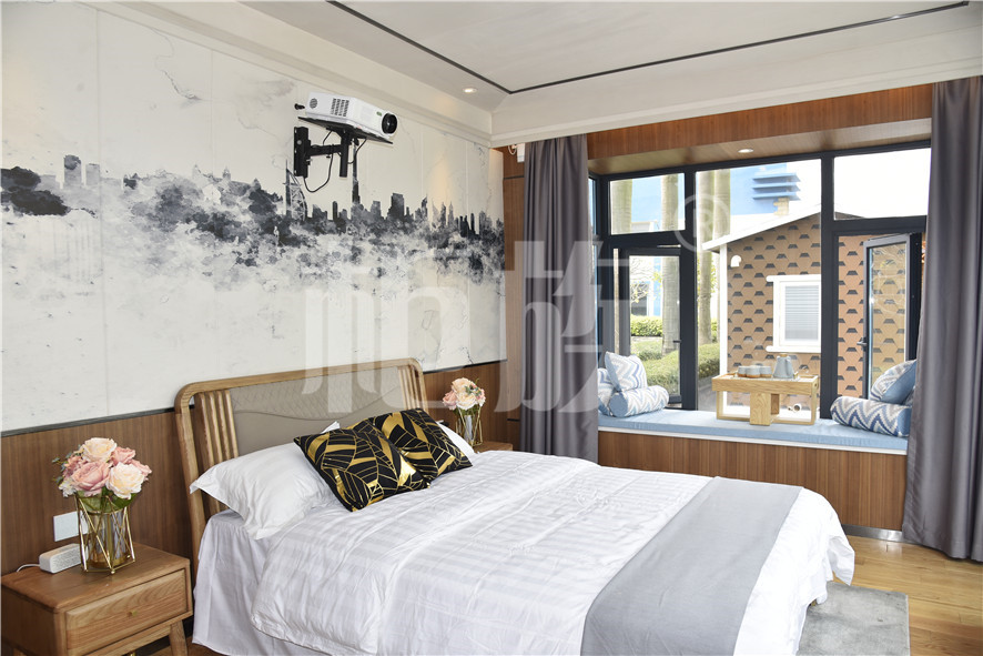 功能布局:入戶臺階,箱子整體抬高,前廳設吧臺和茶幾,樓面為隱藏式升降床,中部為衣柜、洗手臺及衛(wèi)生間,臥室內(nèi)帶飄窗陽臺,配影音系統(tǒng)。大面積落地玻璃窗,適合觀景。設計用途為景區(qū)特色民宿。
