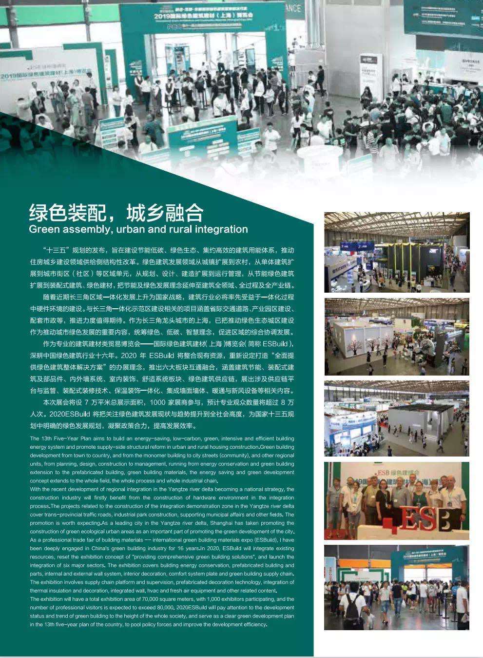 2020國際綠色建筑建材(上海)博覽會(2020ESBuild)于7月15日正式拉開帷幕。2020ESBuild以打造“全面提供綠色建筑整體解決方案”為理念,推出六大板塊互通融合,涵蓋建筑節(jié)能、裝配式建筑及部品件、內(nèi)外墻系統(tǒng)、室內(nèi)裝飾、舒適系統(tǒng)、綠色建筑供應(yīng)鏈,展出涉及供應(yīng)鏈平臺與監(jiān)管、裝配式裝修技術(shù)、保溫裝飾一體化、集成墻面墻體、暖通與新風(fēng)設(shè)備等相關(guān)內(nèi)容。