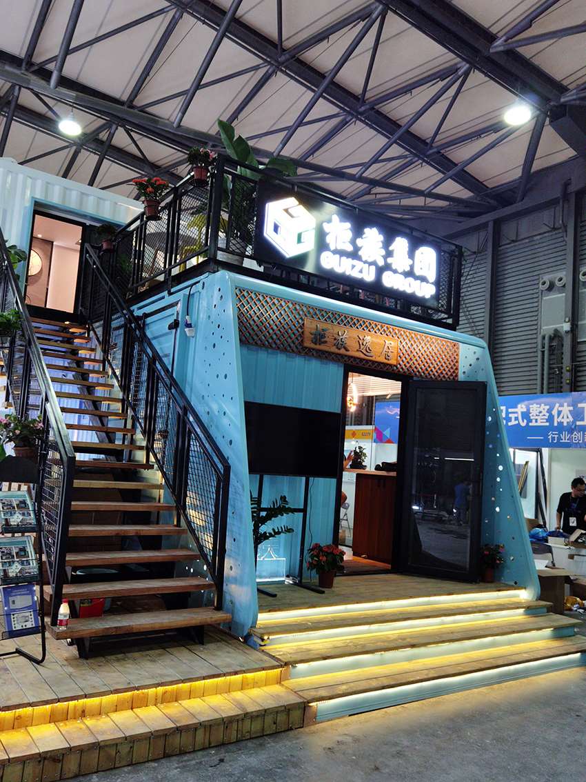 柜族本次參展的產(chǎn)品——逸海小筑位于E2裝配式建筑展區(qū)的2269展位,是一款以藍(lán)白為主色調(diào)、融入了水與波浪元素的海洋風(fēng)集裝箱別墅。該產(chǎn)品的設(shè)計理念為環(huán)保、舒適、旅居,以不破壞場地與自然環(huán)境為出發(fā)點,整個產(chǎn)品為工廠預(yù)制完成,地面抬高3個臺階,有效隔離了地面的潮氣。箱子著力點有圓柱支撐,底座圓盤加大了受力面積和整體平衡性。箱子整體分為一、二層兩個模塊,用吊機和平板車整體裝卸運輸,在選好的平整地面直接擺放就可以入住使用了。
